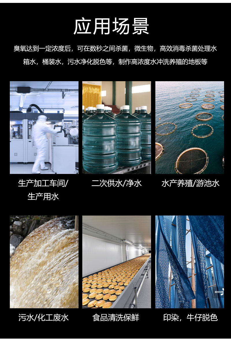 產(chǎn)品廣泛應(yīng)用于食品飲料企業(yè),清洗消毒礦泉水、純凈水、自來水等殺菌消毒,學(xué)校、部隊、機(jī)關(guān)、工廠等公共食堂對蔬菜、水果、肉類等殺菌消毒,水產(chǎn)養(yǎng)殖場對養(yǎng)殖用水殺菌消毒,防治水產(chǎn)類疾病,污水處理和垃圾處理中強(qiáng)化殺菌消毒氧化殺菌脫色,泳池、庫房、小區(qū)供水等用臭氧水殺菌消毒,對農(nóng)產(chǎn)品如蔬菜、水果等殺菌消毒,減少農(nóng)殘。