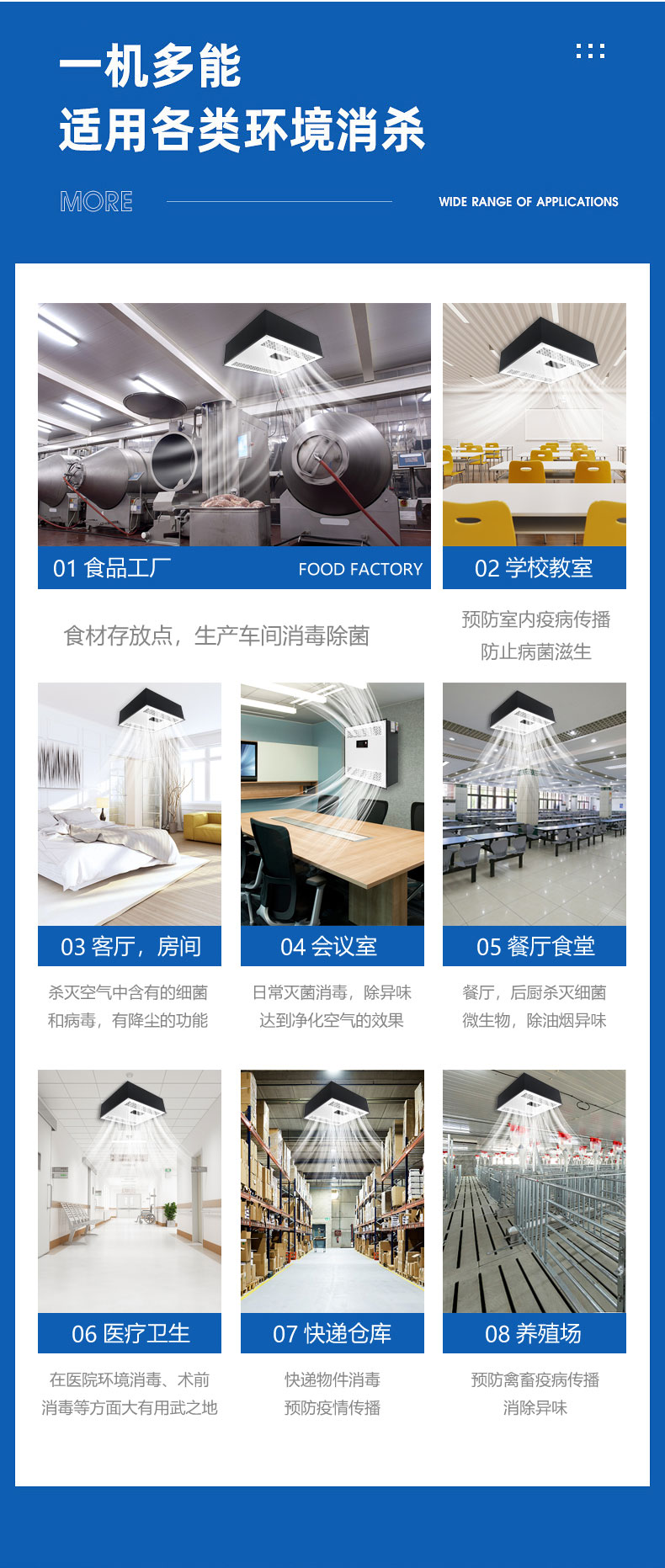 適用于對室內(nèi)環(huán)境空氣和特定作業(yè)空間的消毒凈化。如辦公室場所、醫(yī)院、學校、會議室、檔案室、娛樂場所」賓館等;食品、飲料、醫(yī)藥等行業(yè)的生產(chǎn)車間、冷庫、更衣室和其他無HVAC潔凈區(qū)的空間消毒滅菌。