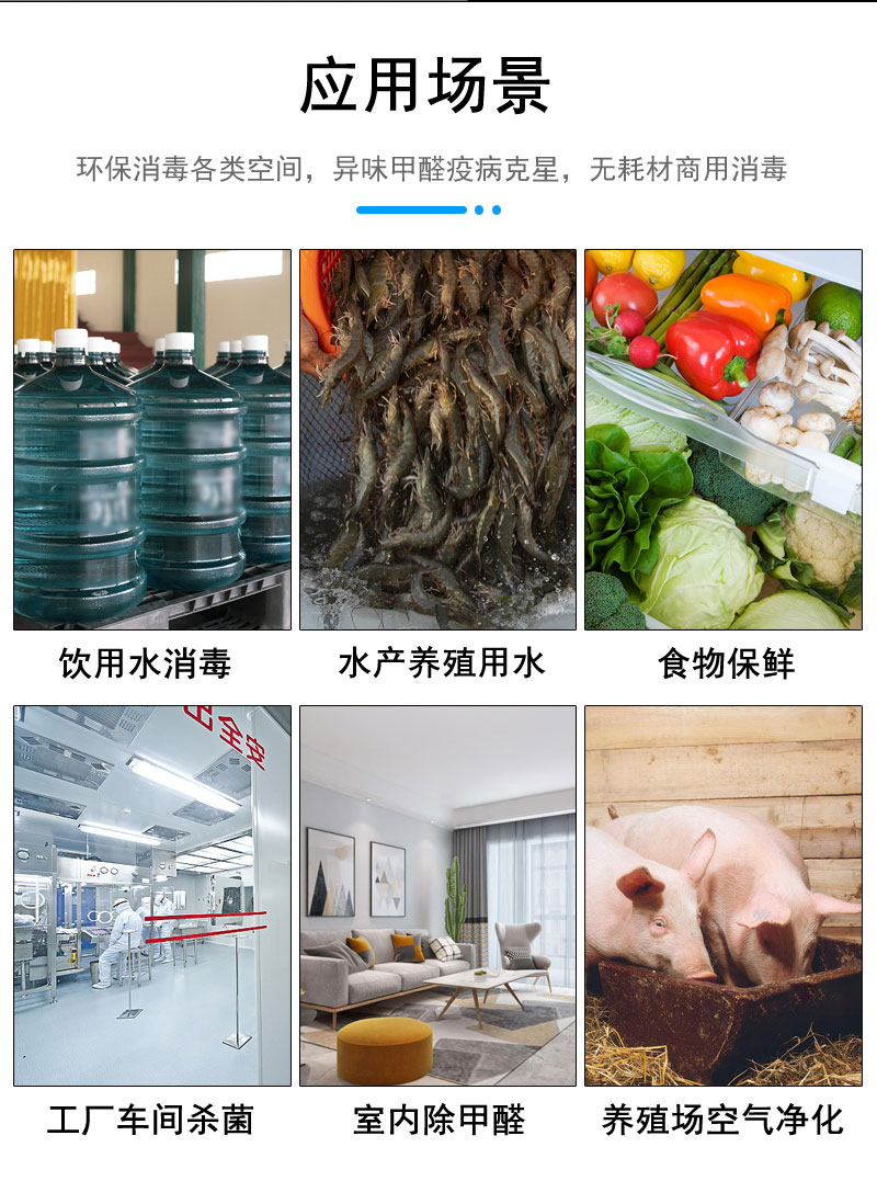 產(chǎn)品適用于對(duì)室內(nèi)環(huán)境空氣、水處理殺菌和特定作業(yè)空間的消毒凈化。如魚塘、泳池、辦公室場(chǎng)所、醫(yī)院、學(xué)校、會(huì)議室、檔案室、娛樂場(chǎng)所賓館等:食品、飲料、醫(yī)藥等行業(yè)的生產(chǎn)車間、冷庫、更衣室和其他無HVAC潔凈區(qū)的空間消毒滅菌。